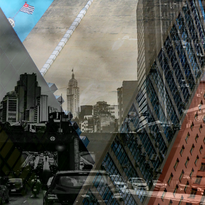 Photographs with high contrast and overlapping shadows simulating the double exposure technique. Colored and black and white everyday scenes of downtown São Paulo