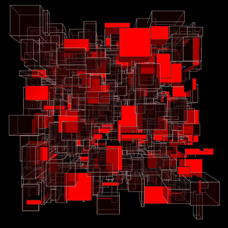 GLASS BLOCKS is a randomly generated structure of 600 intertwined blocks. 20% of the blocks are red opaque blocks, others are semi-translucent glass blocks. A directional light source highlights the 3D perspective of the structure.
