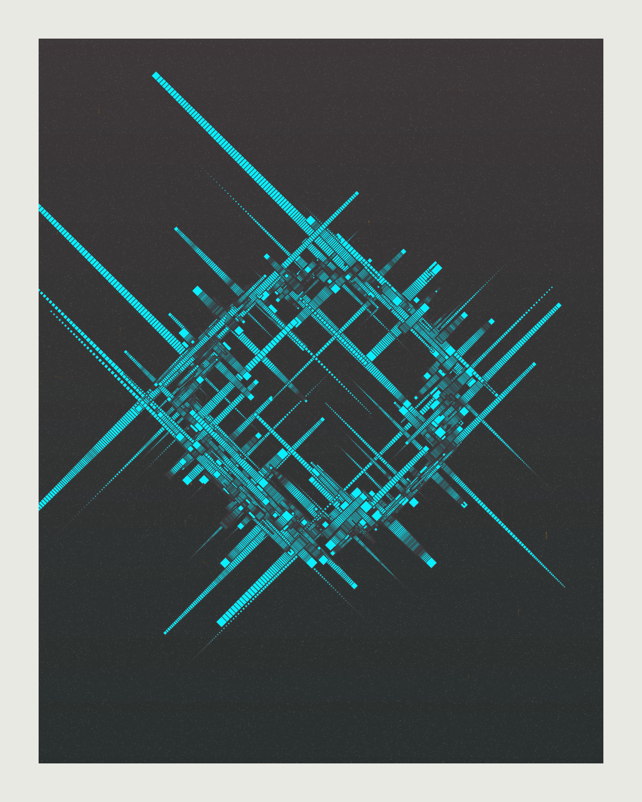 Initial conditions are stated, and then the particles set in motion - the root of generative art. My goal with this piece was to create an illustration that seemed to be from an earlier (or perhaps later?) time; not, at any rate, our current moment. The background is a very subtle gradient; then it is heavily stippled, and followed with a particle system to create more subtle texture. (Look for the very small "hairs" in the background; they are more obvious on the dark ones. They are a subset of the main particle system.)