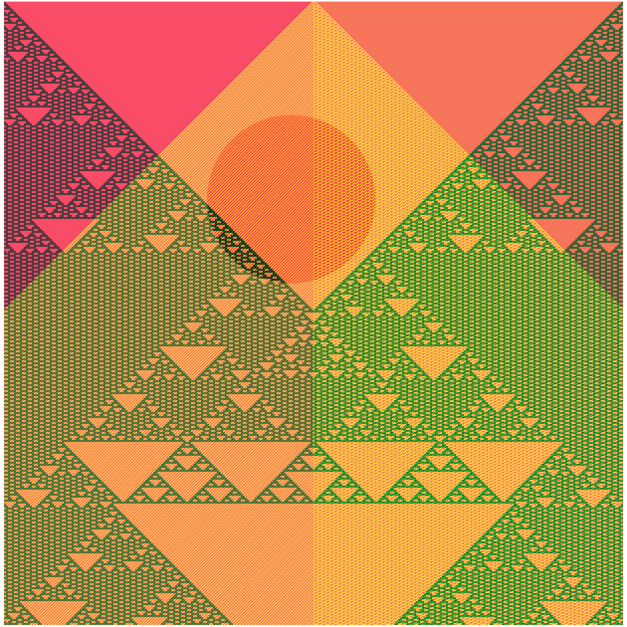 First, a grid with random dimensions is created. A color palette is randomly selected from a large number of palettes, and a cellular automaton is formed based on one of the rules, and this operation may be repeated randomly to form a relatively more complex pattern. Finally, a number of geometries are combined with the automaton to make the mint harmonious and unique.