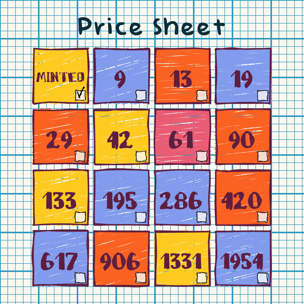 Each of the numbers inside the square, from left to right, determines the next price of the mint. So the rule is simple, check the previous price, use the number inside the square for pricing. If, for any reason, the pricing is different from the specified numbers, the next price of the work will be determined according to the increase factor of the numbers inside the squares.