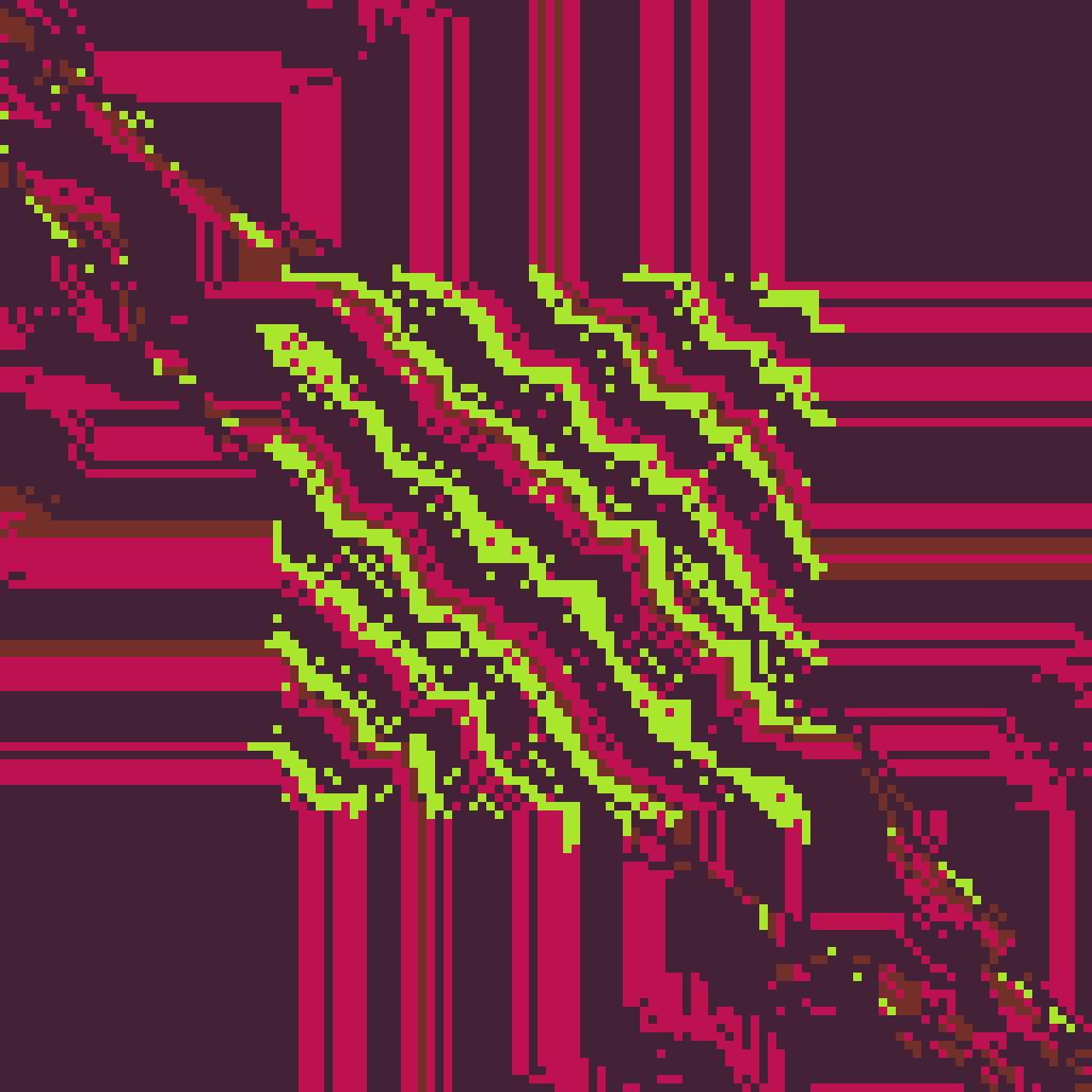 if(r()>.4)f+=.5p(s)sspr(1,1,126,126,0,0,v,v) -- lazy entropy locking calibrated to trigger often, tied to the color cycling and the sspr call