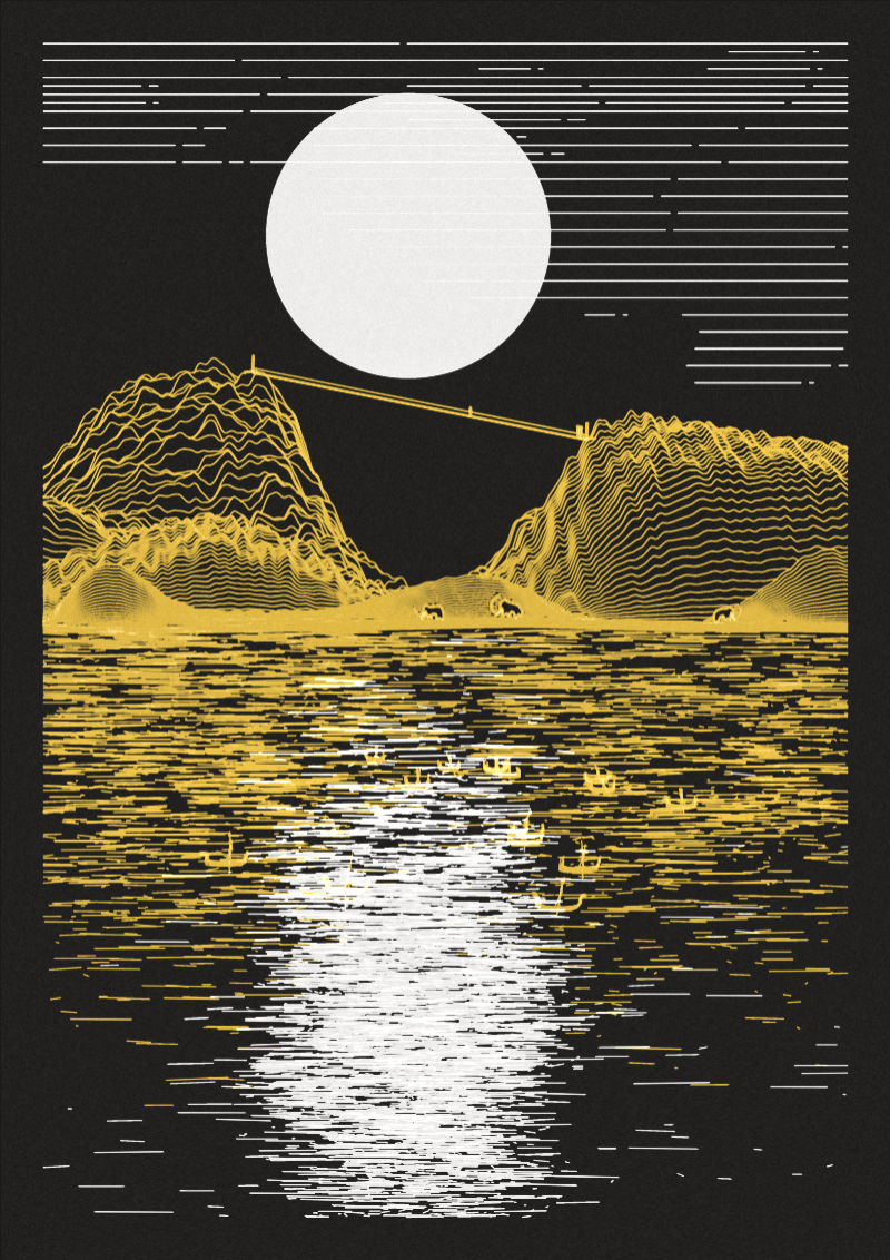 The digital version simulates ink effects and adds a subtle animation over the water. Each outcome is also physically plottable with pens: A SVG file can be exported (right-click save) to plot the piece physically. The plots are designed to be executed in A4 format on either fountain pens (on white paper) or gel pens (Black / Blue).