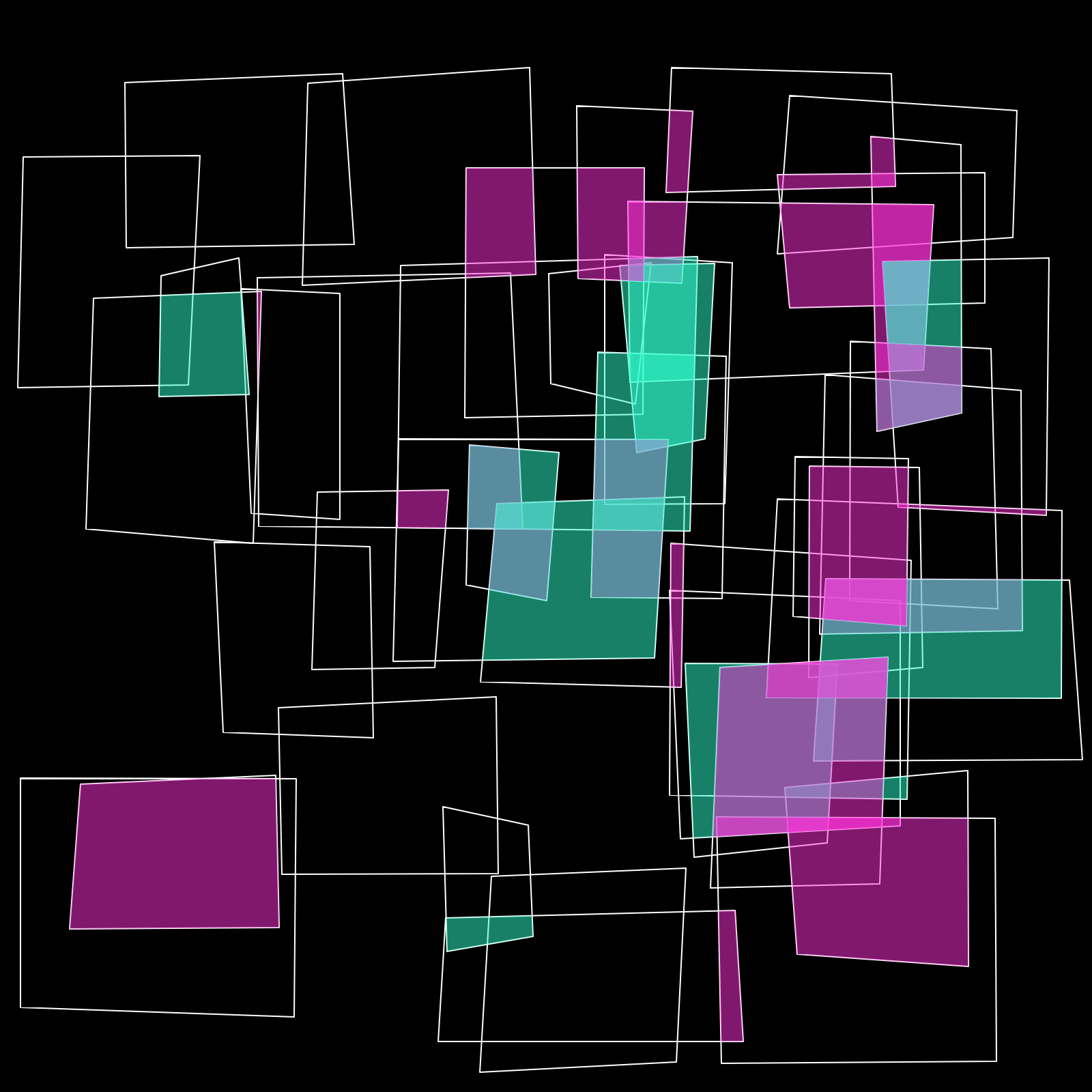 A simple study in color and shape overlap by Nate Donato. This collection features a large number of generative quadrilaterals and a unique painting algorithm of tinting select overlapping sections, combining to produce a wide range of unique outputs that toe a visually pleasing line between order and chaos. Inspired by early computer art pioneers such as Georg Nees and Vera Molnár, the piece builds on their work exposing how even simplistic algorithms can lead to exciting and unexpected results.