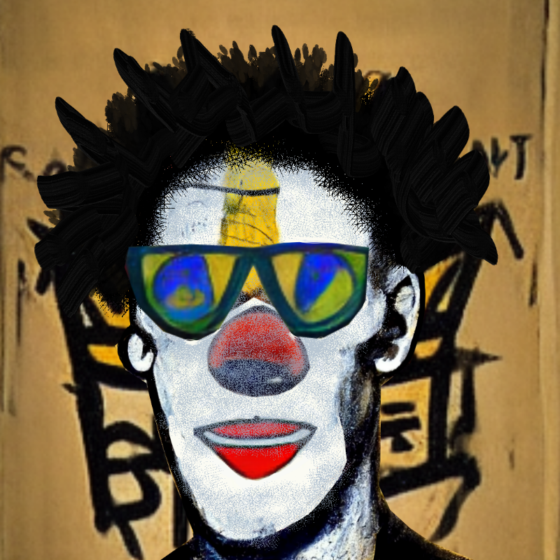AI generated attributes, cropped, positioned and painted over to produce a wonderfully, sometimes bizarre Basquiat-inspired clown pfp collection.