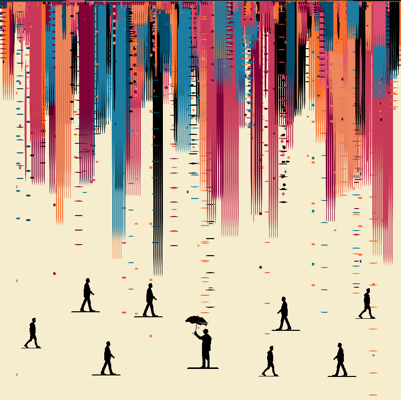 Reflecting the sense of society through the city. . This generative art has a treat - People (Umbrella Man, Ballerina, Couple, Girl) - 6 brush color combinations - 6 background color - Detail mix brush