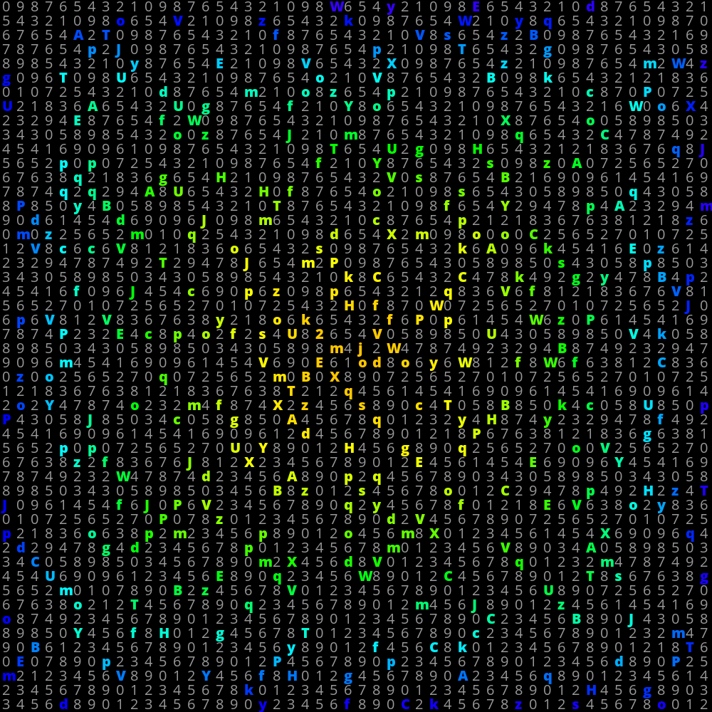 This piece combines the mathematical phenomenon of the Ulam Spiral, ASCII and generative art. The foundation of each piece is a spiral in which prime numbers are highlighted. The value of these prime numbers is replaced by the hash used to make the art.