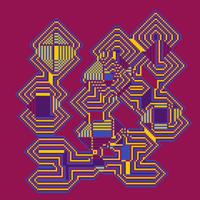 MINI-EXPLOR generated images for output on line printers and early CRT displays. It had a limited palette of 4 “characters” that consisted of configurations of alphanumeric characters, some over-struck, to produce a grayscale. In our representation we have replaced these alphanumeric character configurations with the concept of a “cell” consisting of 5x5 pixel blocks. For now, our picture space is in keeping with the original 140 character limit thus, the image size is 5 x 140 or 700 pixels in height and width.