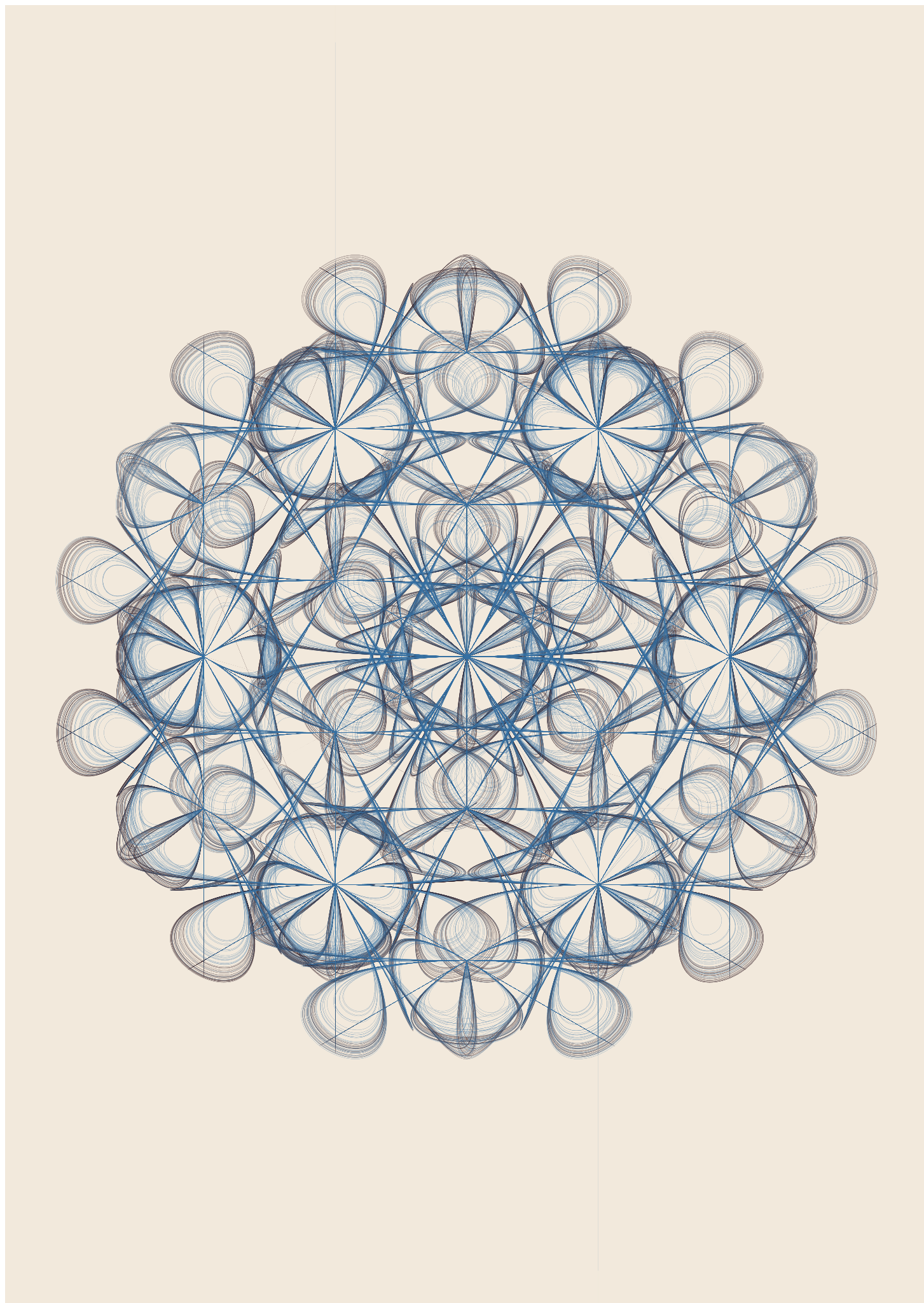 Limina is a meditation on the concept of emergence, a concept that lies at the heart of generative art. The algorithm that defines the core of the series is only capable of making one simple choice: left, right, up or down? As it moves across the canvas, it leaves a trace of points that are connected by a curve. The order in which these points are chosen and the tightness of the curve connecting them is what creates the visual diversity of Limina. As these values fluctuate, symmetries emerge and break down again, forms, patterns and ornaments are created and combined to form both complex structures and simple abstractions.