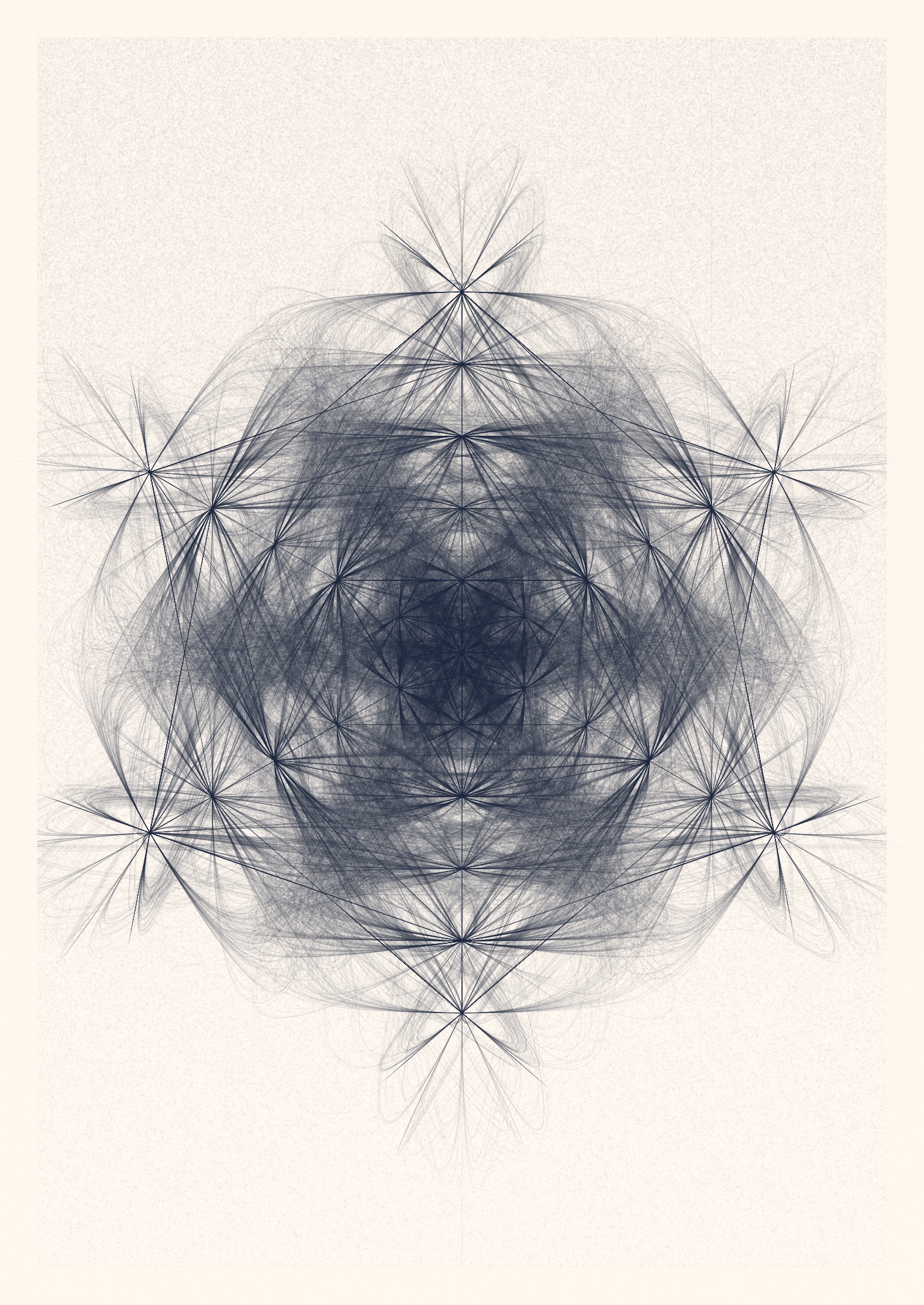 Each piece of the collection is made up of just one or two lines. These lines are defined by thousands of points that are chosen, one by one, by a simple algorithm moving across the canvas. What arises from that simple concept is a surprising variety of intricate patterns, accidental symmetries and traces of order in chaotic structures.