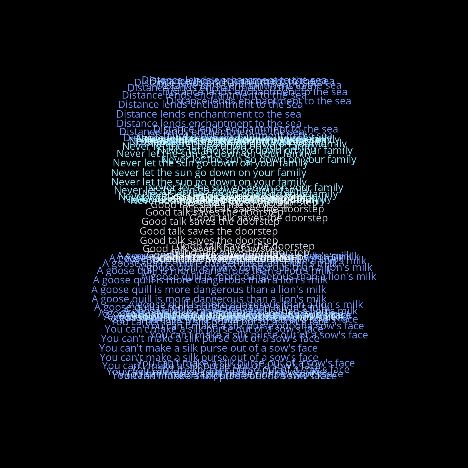 Each work features 5 Malaphors (mixed up proverbs) each in a color from one of 15 palettes.