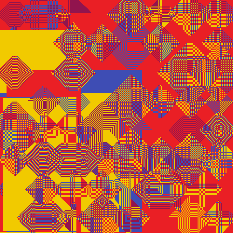 The EXPLOR functions are designed to interact with the current contents of each cell in the picture array. Every EXPLOR function has a rules parameter. In this test I’ve added a background. Thus when I draw my modified CPoSOP widget over the background it interacts with the color contents of a background cell or, the color of the cell based on a previously drawn widget.