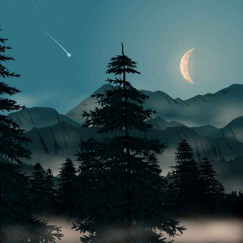 In this work I tried to depict variations of a forested mountain landscape lit by moonlight. The trees, mountains, sky, clouds, moon, stars, everything is generated 100% with code using random numbers from various distributions.