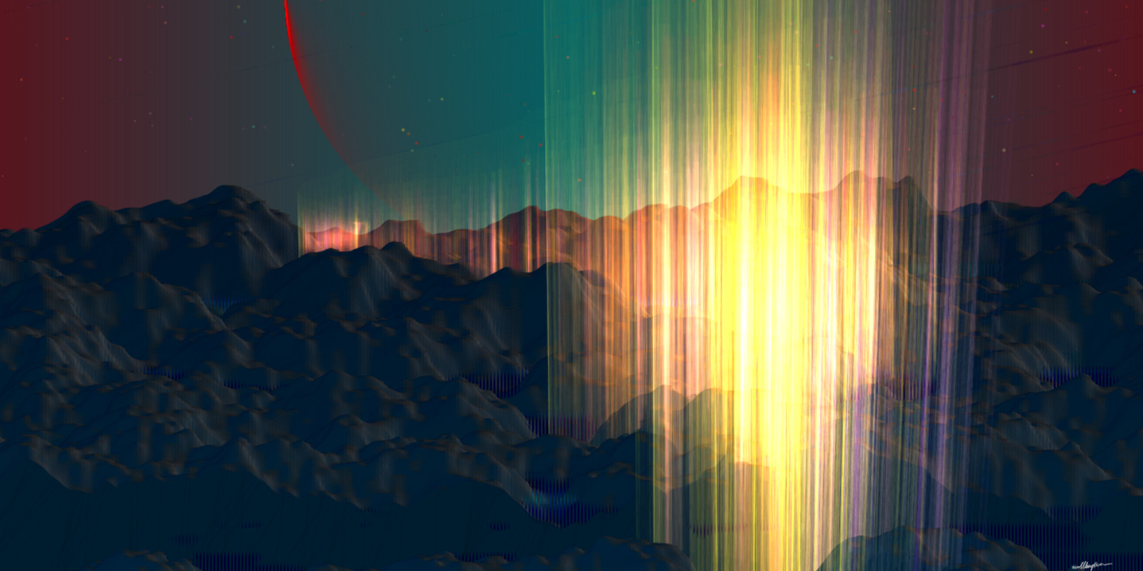 This moment becomes bottomless. Landscapes glitter vividly with altered gradients, fog emits at the far end of the land, and Energy leaks and escapes from the core, thru the cracks in form of aurora structure.