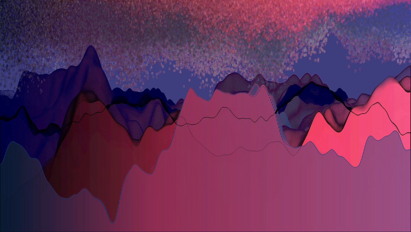 Landscape with algorithmically generated mountains, with precipitous drops, great peaks and data clouds