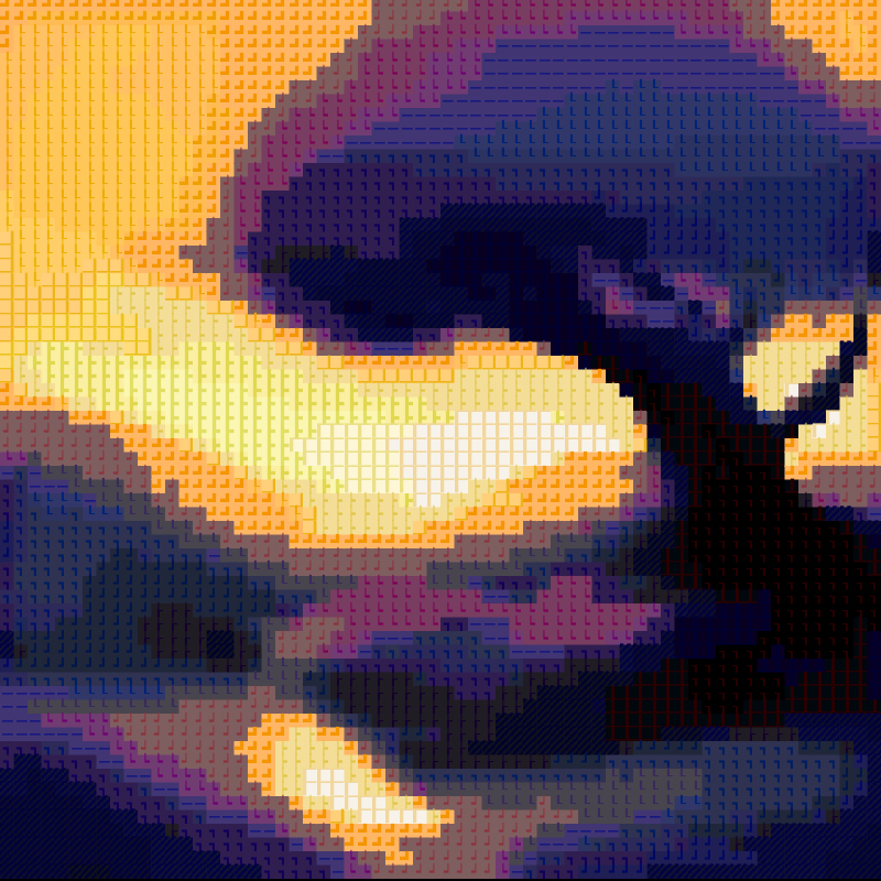 On top of the image generated by the neural network, there is a processing script that converts the value of each pixel into a colored ASCII character, the final result is a 64x64 vector grid with 4096 text symbols.