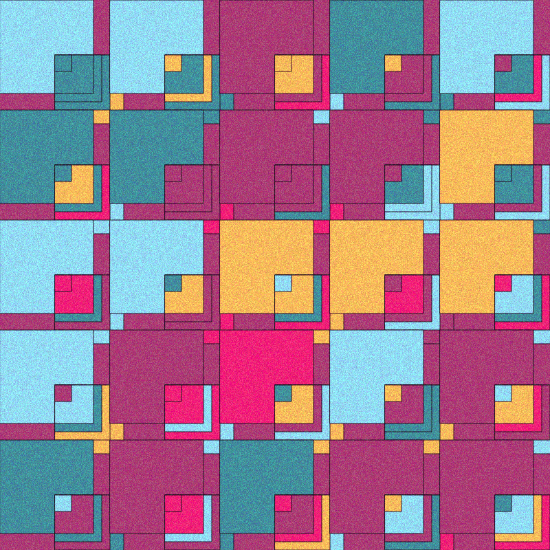 Uniquely Generated Grids of Terrace Tiles One of 5 random grid sizes One of 10 Palettes including a monochrome palette (13% Chance) Granulation Effect is 80% Chance with the remainder having a rare non-granulation (clean) effect