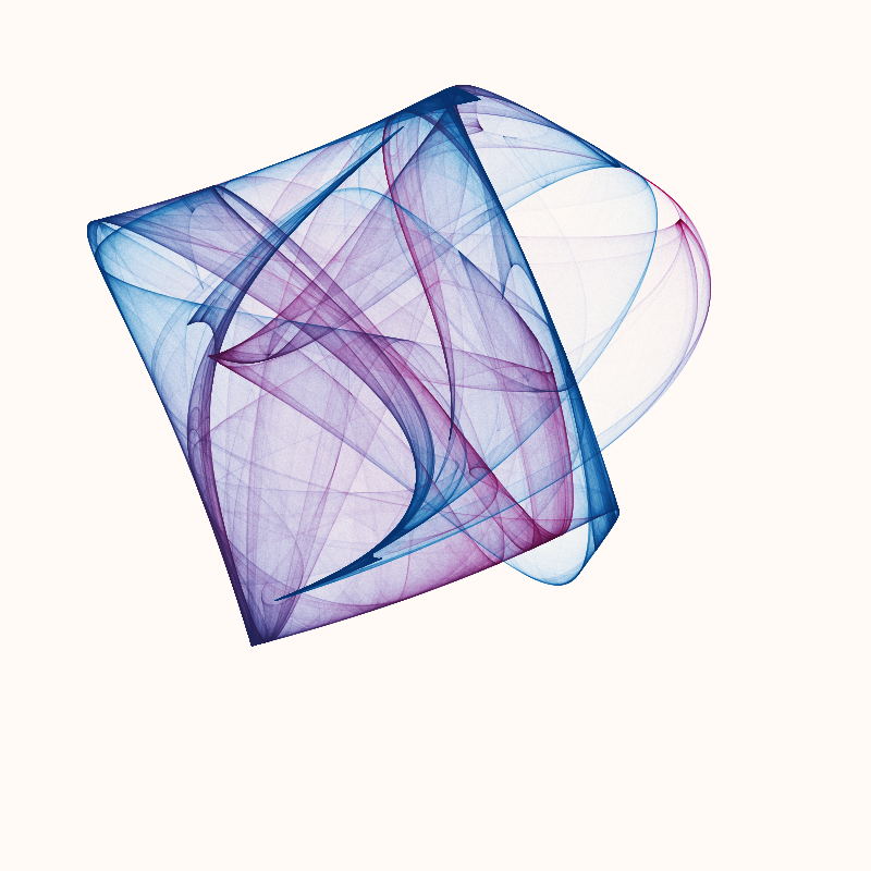 In art, and in generative art especially, we often find ourselves with loose ends, experiments that don't make the final piece. These go often unappreciated and are left unpublished and unseen. When making my last project Mycenae I (re)discovered a number of related attractors. Rhea has sharp corners in place of sweeping arcs. Phoebe turns back on itself, long curves join at harsh vertices.