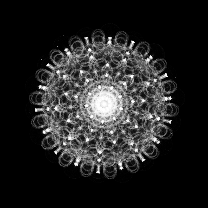 This piece rewards patience. After the initial structure forms, watch the attractor develop as more iterations are added and the details resolve. The image will continue to refine itself forever; there is no limit on the iteration number. Pause, unpause, generate and export jpgs at very high resolutons (see controls below).
