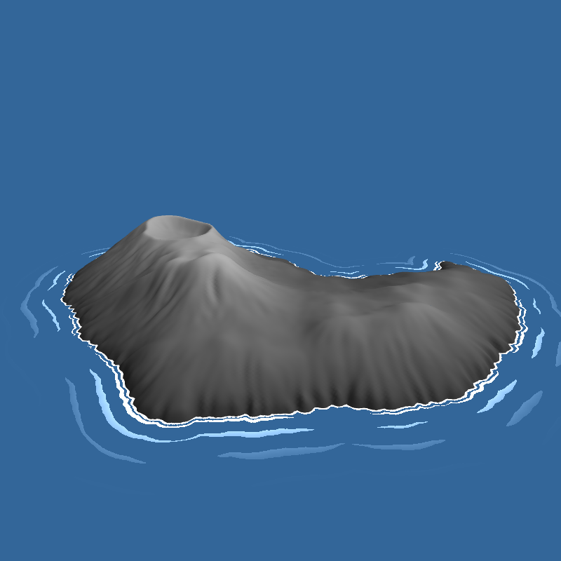 A procedurally generated volcanic island, with waves crashing against the shore.
