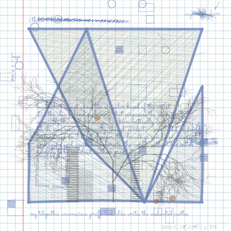 One reference that appears in every token is to Sol Lewitt, an incredible source of inspiration. His artworks consist of instructions. Your sketch book pages contain instructions too. You will find the instructions for the artwork scribbled on your unique page by pressing i.