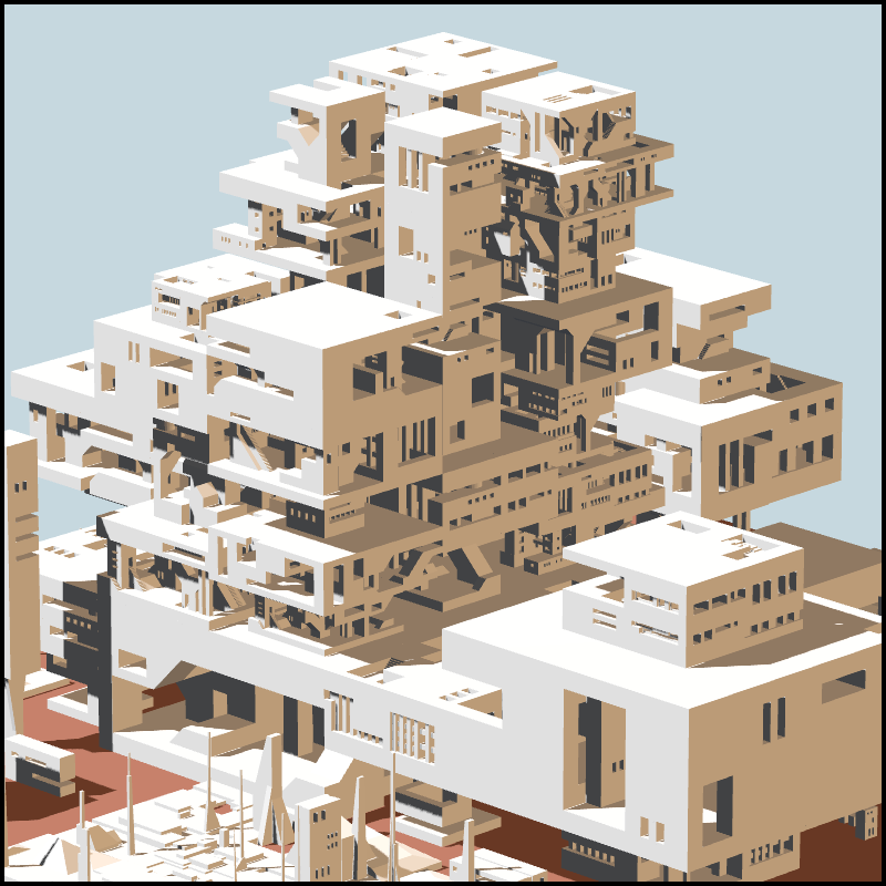 New Territories is the sequel to Cityblocks. In this series, urban ensembles are generated with a simple click. With each iteration appears a new densely built city block. Graced with impeccable geometrical lines, devoid of any human presence, these buildings remind us of brutalist utopias like Le Corbusier’s Cité radieuse or Niemeyer’s Brasilia. But despite their clearly modernist feel, there is something hauntingly primitive about them. They could be either New Mexican adobe pueblos, Minoan palaces, or Turkish troglodyte dwellings. Both carved and sculpted, these Ghormenghasts of concrete float in a realm out of time, like in some architect’s dream.