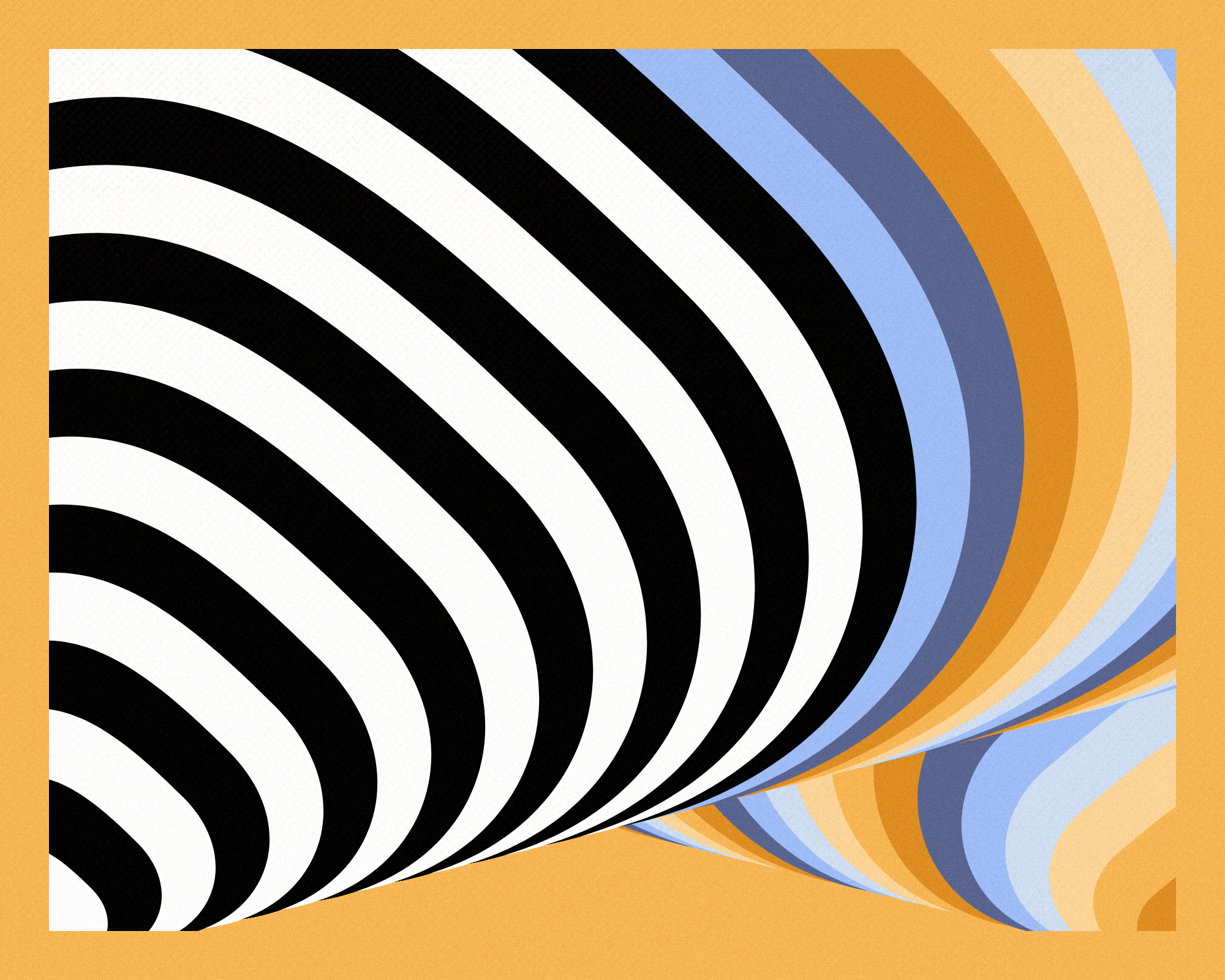 Curved shapes with alternating color overlap, creating visually interesting forms. Occasionally colors form a gradient.