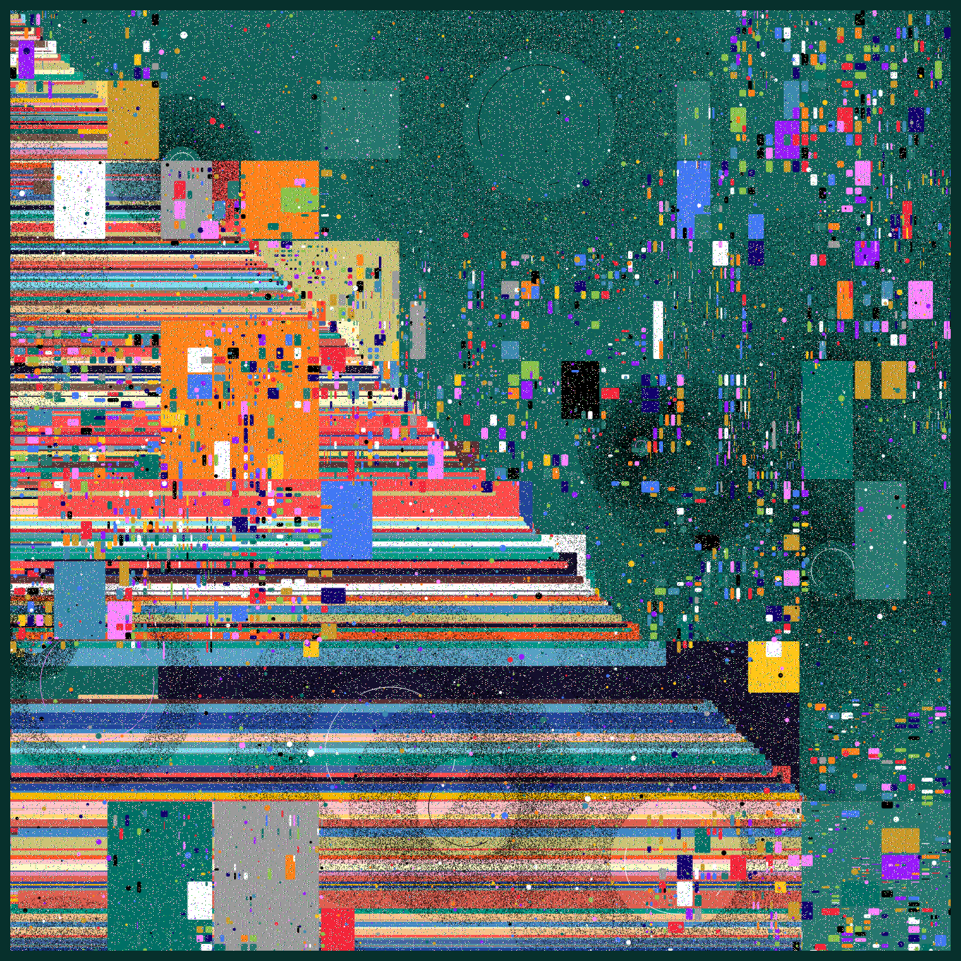 Twenty-two different color palettes and three different borders with random colors are used in this artwork.