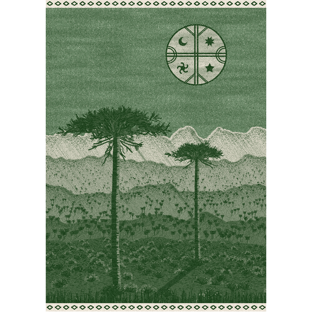 ARAUCO is a tribute to araucarias and Mapuche iconography. Incorporating elements such as the Kultrung, the Wünelfe star, and the staggered cross Ngümin, the work displays a typical landscape of southern Chile with the Andes Mountains in the background and the native forest.