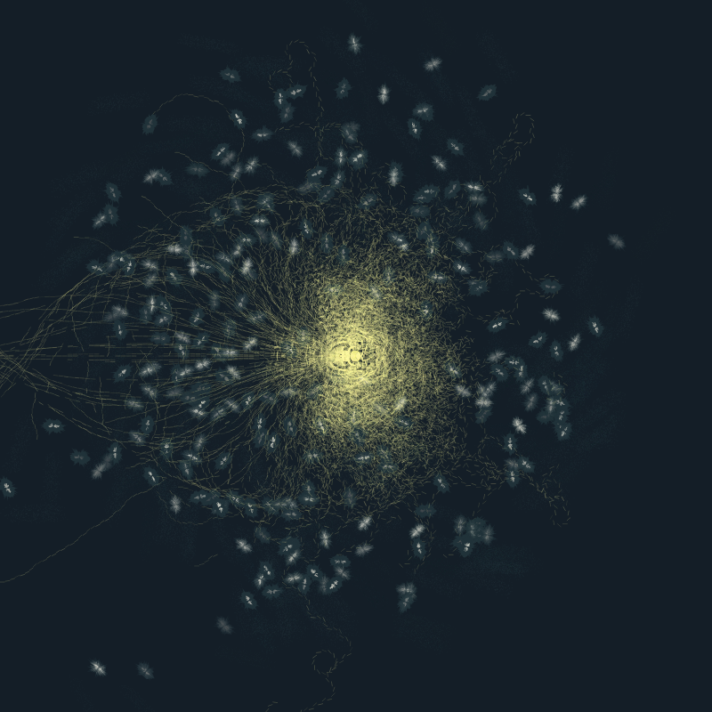 A naturally chaotic yet orderly distribution based on the collatz algorithm sweeps branches, flowers and polen. The paths are always different yet they all lead to the same place.