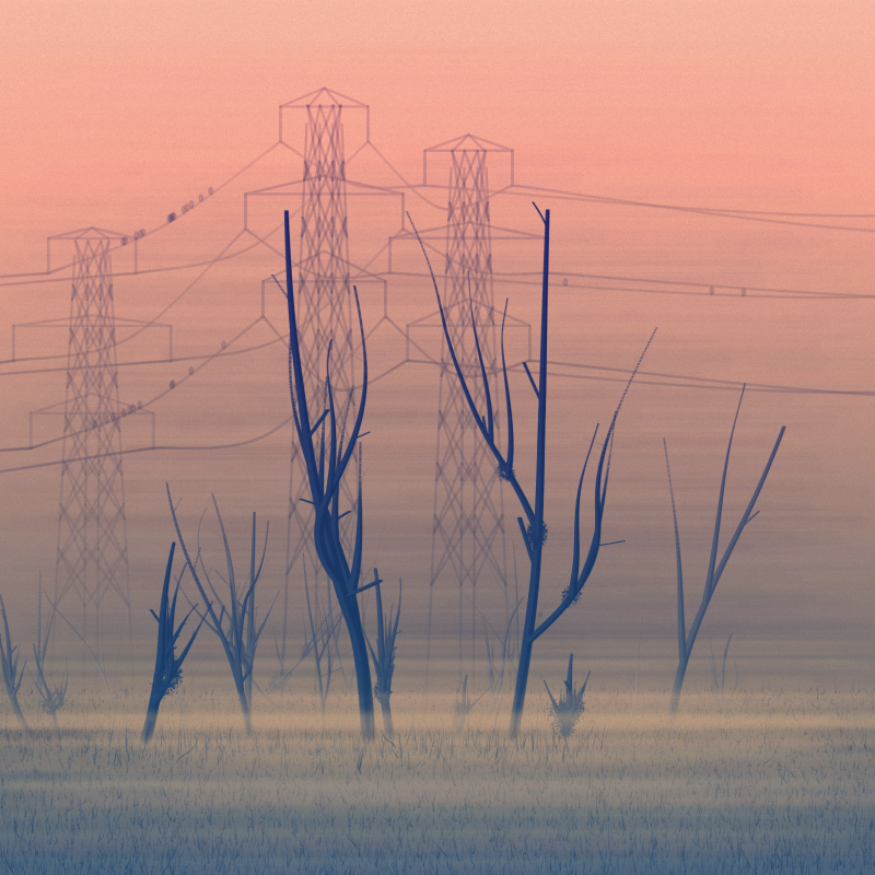 A procedurally rendered foggy 'n frosty scene with a few trees and transmission-poles in the background. Sometimes with old ruins...