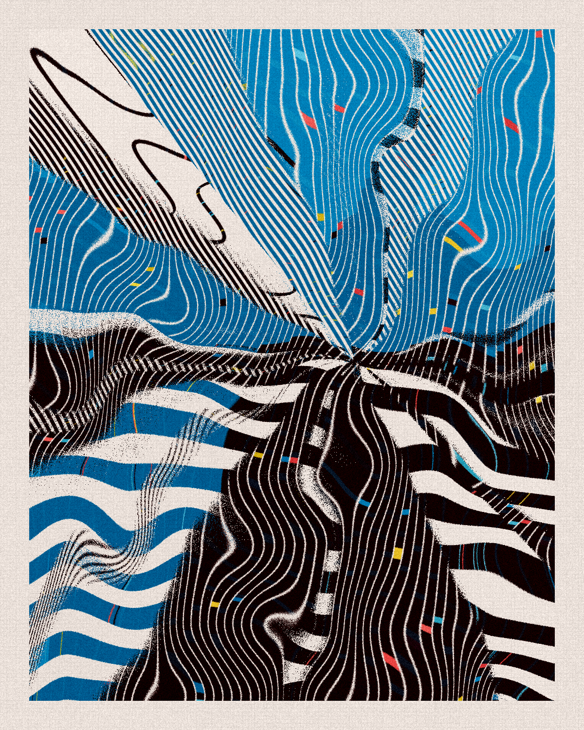 My first foray into shaders and GLSL: This piece experiments with layering many textures guided by an underlying pattern. Each pixel value dictates which pattern is displayed. There are varying levels of imperfections in each pattern, some choose a single color, some use a color guide pattern, some individual strokes decide on another color altogether. These layers are compiled in a shader and warped.