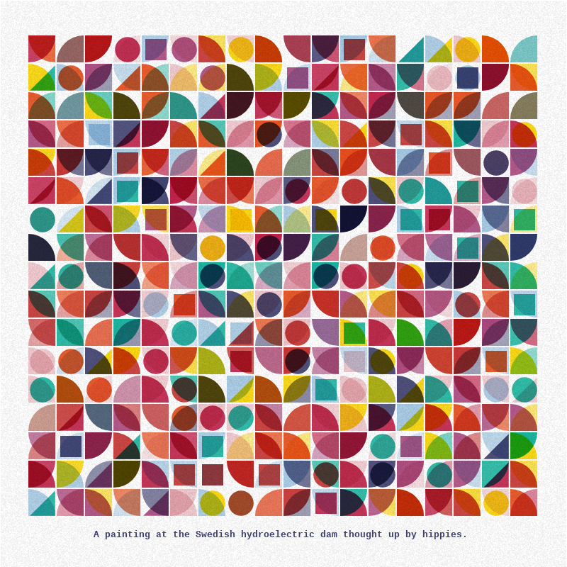 Canvas / Javascript. Generative tiled composition of shapes. Generative prose explaining the work. Multiple shapes, variable grid size, colors schemes are meant to be funky, noisy background, optional layers and border.