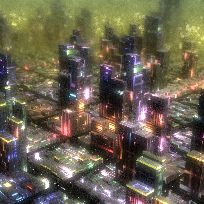 Finally there is the post processing shader, for which I developed a noisy bloom effect and a depth of field algorithm that receives from the main shader the distance from the camera for each pixel using the alpha channel.