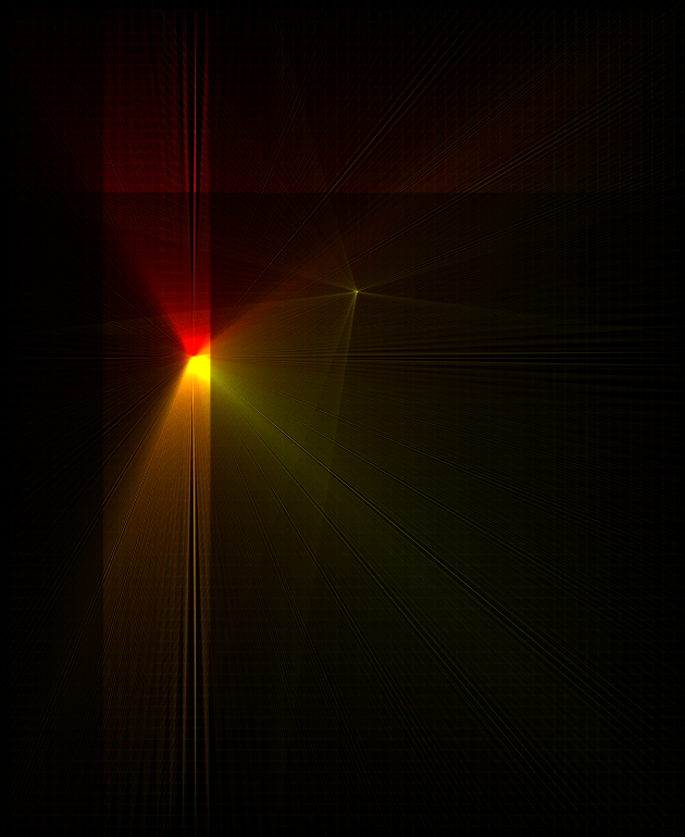Here, we got very fine lines obtained from the reciprocal exponential function (something like y = 1/A^x) and the color are mapped according the frame counting in HSL mode. This combination of parameters allows us to get very vibrant and colorful gradients that moves smoothly in ellipsoidal routes in the canvas. Sometimes the cold saturated tones in monochromatic beams remembers something like lasers in techno/electronic music festivals. On the other hand, the lighter and hot tones have a lot more character like sunrays in the early morning peaking through curtains trying to wake you up.