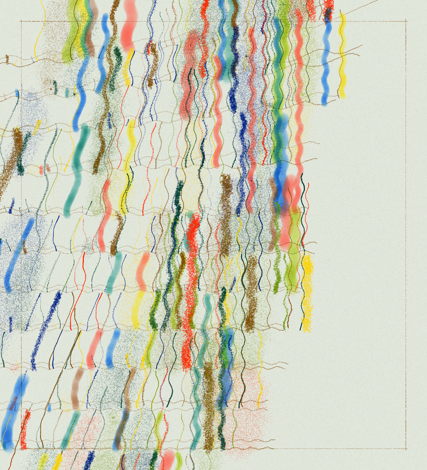 “Enfantines I. Small Talk” is the first of a set of algorithms that explore the basics of Generative Art, written with the aim of preparing artists for the script patterns of digital life. “Small Talk” experiments with grids, flow-fields, and brushes; all with a fresh, almost childish style.