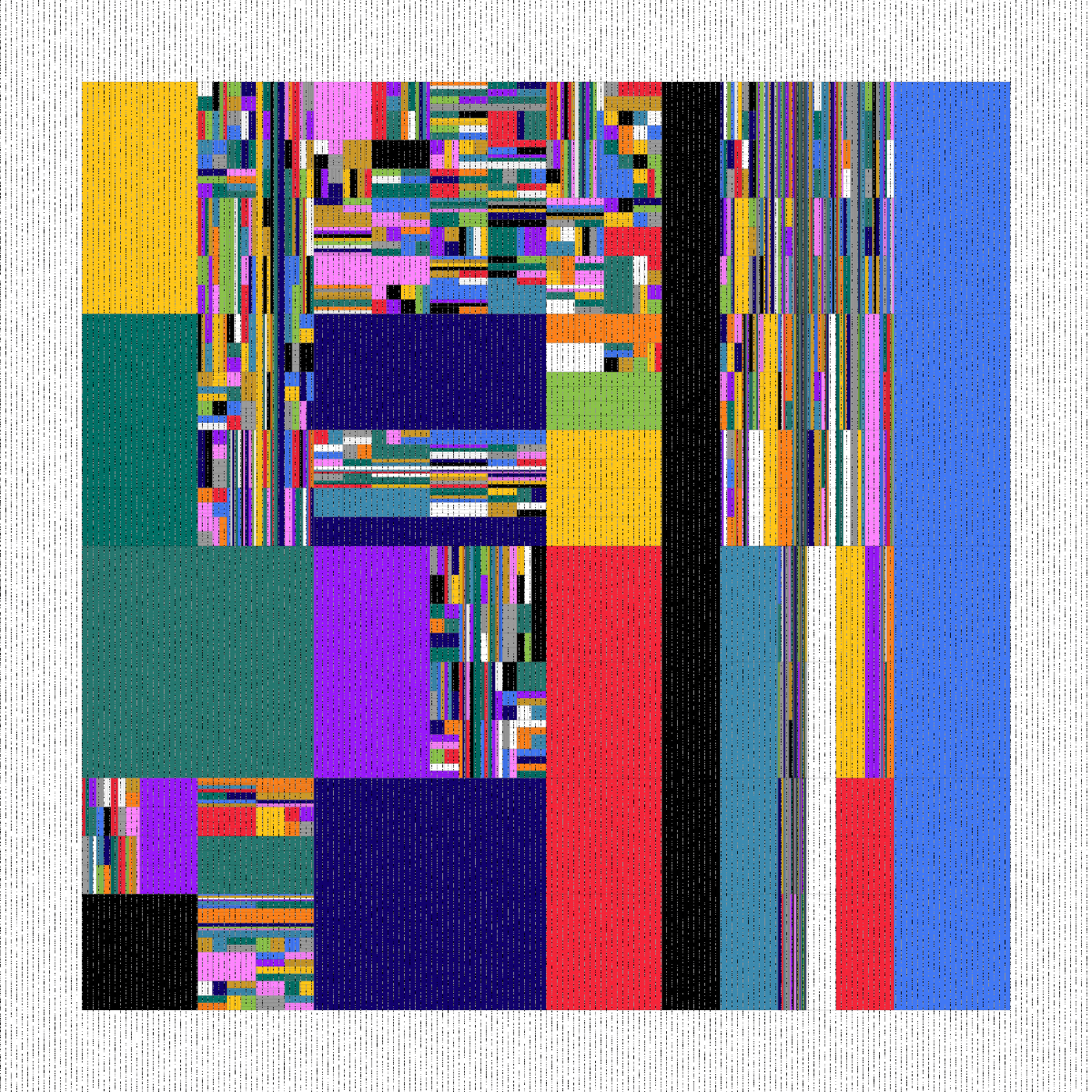 Subtle black lines separate the vast rectangles, which for some are filled with bright or black, or gray; each small component is a member to create a whole and a single visualization, and each aspect of the components receives its visual value from the whole.
