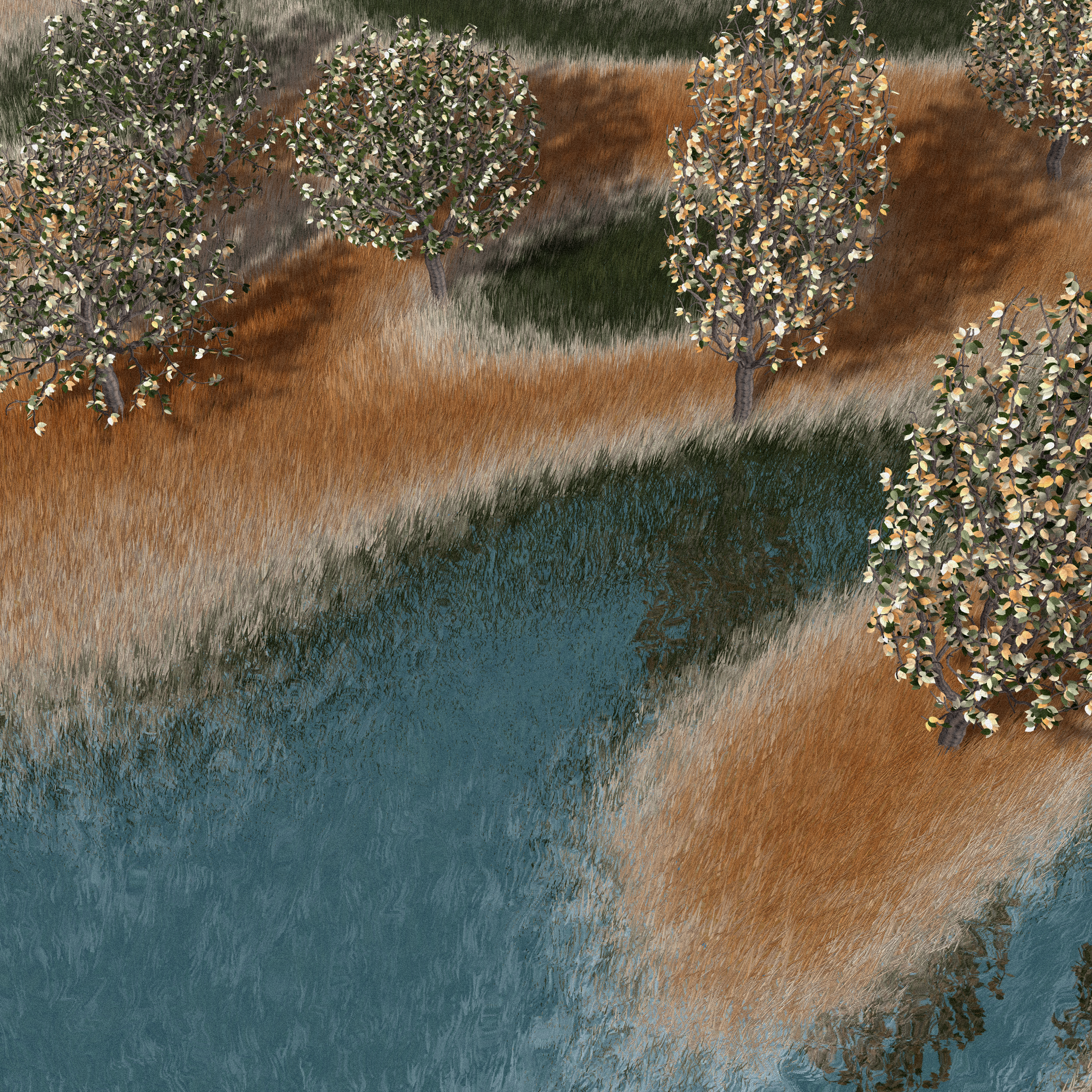 Lands and Clouds are rendered using a mix of simplex noise and FBM (Fractional Brownian Motion), trees are generated with space colonization algorithm an placed using Poisson Disk Sampling distribution. The distribution density is driven by the land heightmap.