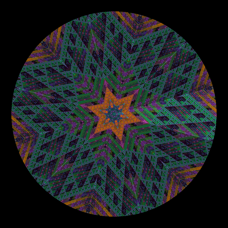The "binary landscapes" generated pseudo-fractal-glitchy images using binary operators. Now are used to feed a kaleidoscope, giving order to chaos. You can download both the original "binary landscape" and the screenshot.