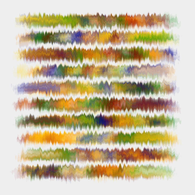 In this version, 10 variegated lines (each one consisting of a hundred or so coloured rectangles) are post-processed with a little noise, resulting in sometimes diaphanous, sometimes detailed forms and 'landscapes' of the imagination.