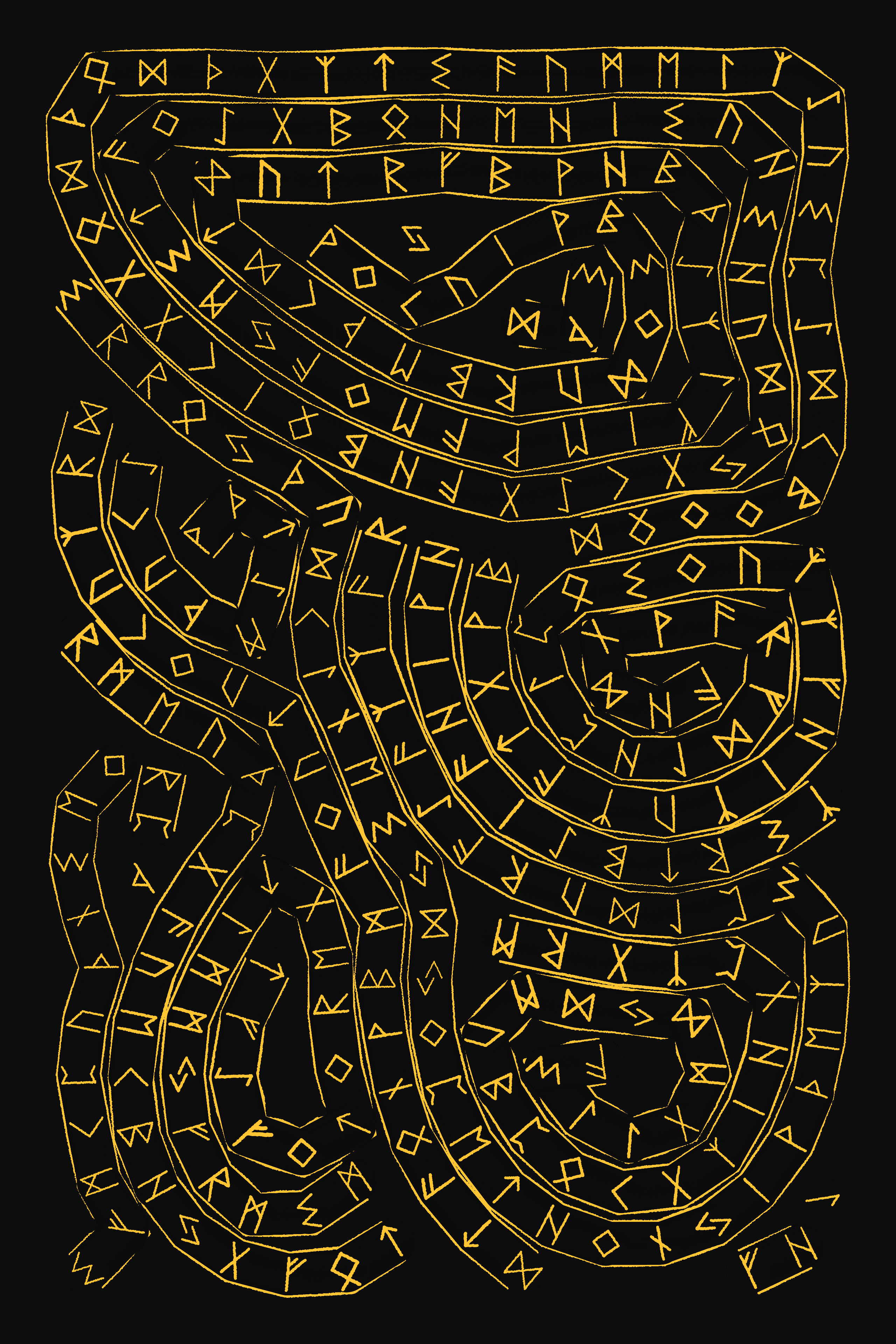 Elder Futhark Runes / Proto-Germanic alphabets flowing through the canvas.