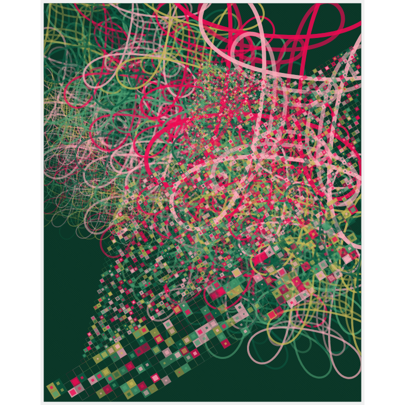 In this work, there is a conversation happening between two modes for drawing the same grid. One is tight, geometric and calm. The other is loose, loopy and excited. They overlap, interlace and compete to fill the space. One cannot exist without the other. Balance is the the key. Between them they create a landscape in which to dream.
