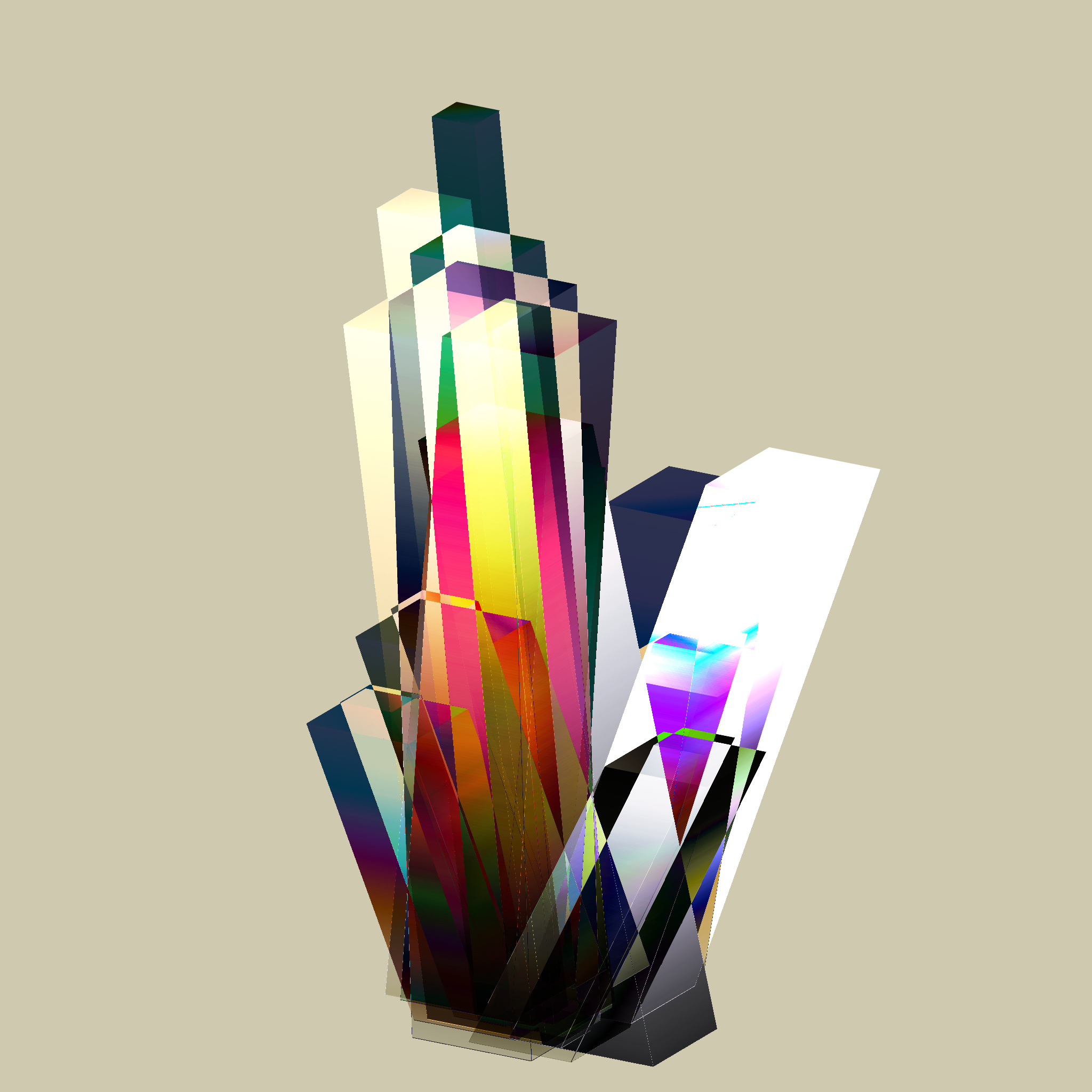 The practice of layering many graphic shapes and gradients with a chaotic mix of blending modes has been with me since my first years of photoshop in my youth. It's a familiar, friendly technique. Yet, I've rarely played with it outside photoshop. Here I take the opportunity to apply this abstract blending technique in a manner that alludes to reality: refracting crystals.