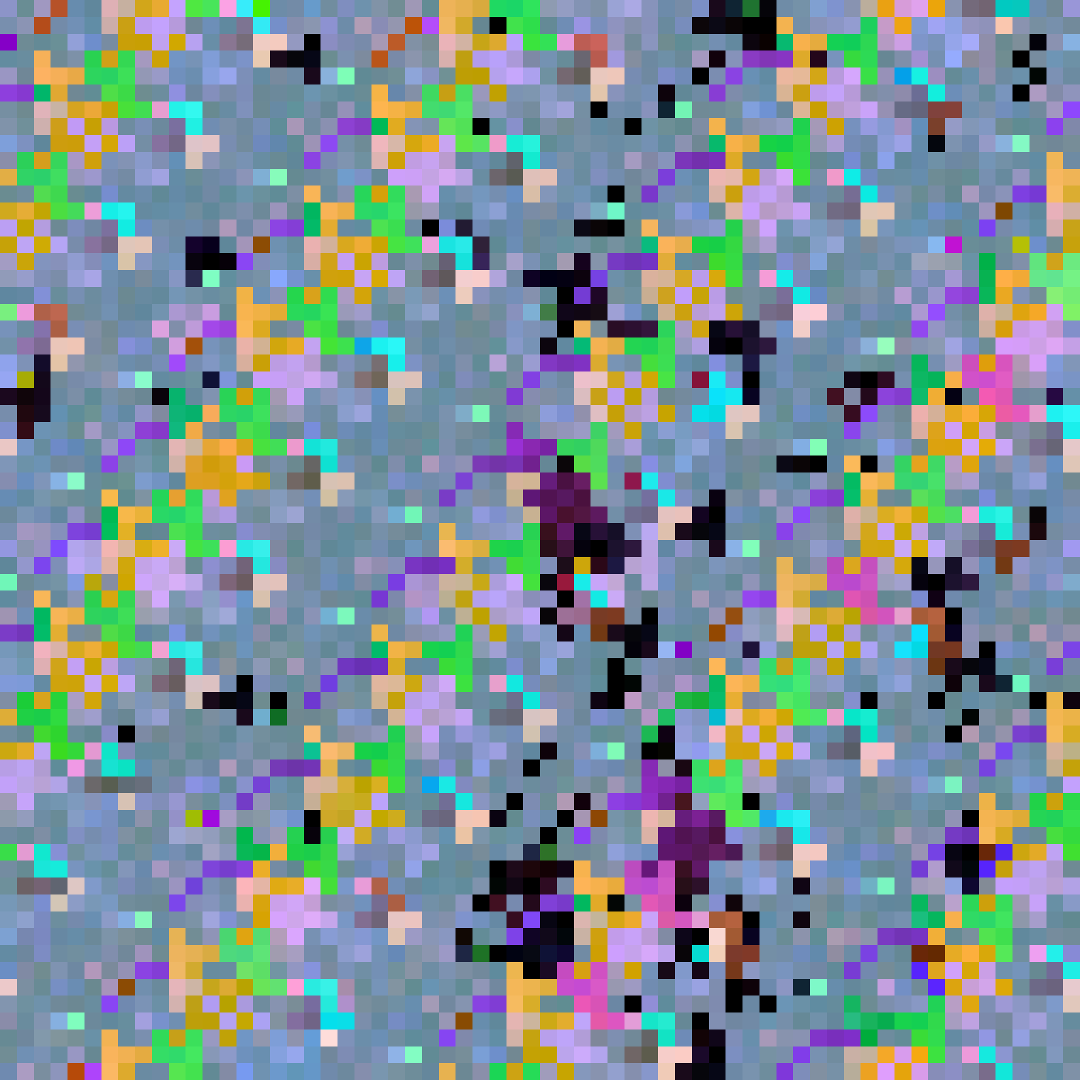 A 64x64 pixel grid is constructed, and a "brush" is used to paint randomly on the screen. For the first 600 frames, the brush can only paint in the base color chosen for this piece (+/- the various color palette factors chosen for this piece). After this initial phase, the brush is changed to one which pushes pixel colors around, modifying them slightly on each pass. At the same time, Entropy Locking is allowed to kick in. During this time, a pixel buffer is used to determine if the Entropy Locking has found a stable solution or not. If not, the seed is incremented. This continues until a stable seed is found, which is defined as one in which for every 4096 (64x64) pixels seen, at least half of them must have had unique x,y values.