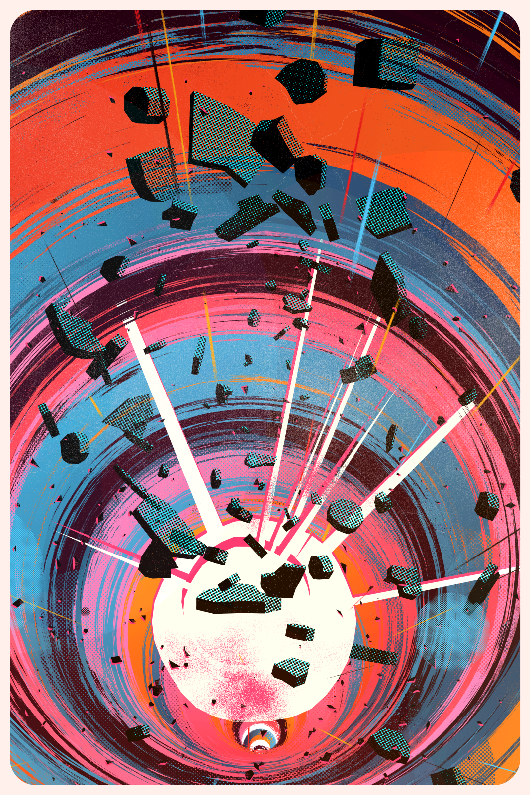 Halftones, dynamic composition and high color contrasts for a groovy composition inspired by action b-movies, their posters and music.