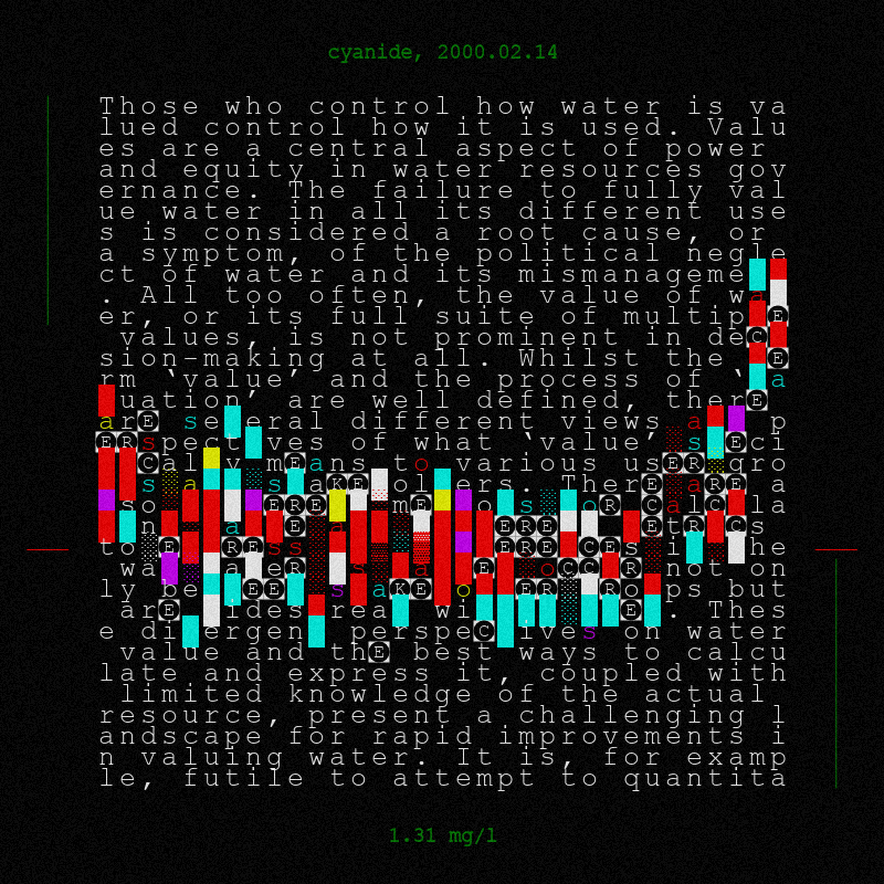 Nature and humans here are bound within a single frame — havoc in the ecological system activates the breakdown of meaning in the human signifying system of language, but hidden in the wave of ecological disaster is a (re)generative love poem to water that bears witness to its multifaceted beauty and power. A second poem is generated as a soundtrack based on the displayed background text.