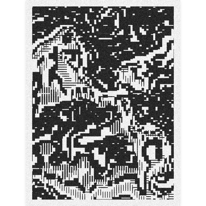 With Un1 I was looking for the final result to have a slightly degraded or low-res look. To that end the pixel density is intentionally set low, (saved images [s] will be based on your browser window size) so that when the piece is enlarged or printed the output has a degraded look.