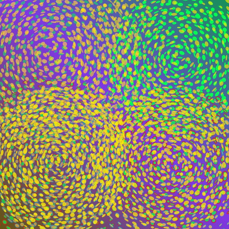 Three layers of sets of 4 phyllotactic spirals are generated. Each "galaxy's" characterstics are modified by random variables: number of elements, size, translation, color and opacity. The interactions of shapes and color are cosmic and profound. Occasionally I am remoinded of Van Gogh's "Starry Nights."
