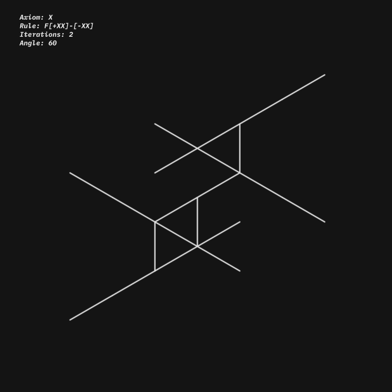 The idea is that each iteration of the artwork can be reproduced accurately using an L-System interpreter by accessing the tezos blockchain through the FxHash API (GraphQL) and interpreting token metadata.