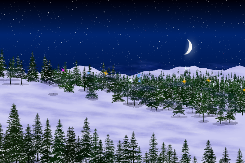 This is a 100% generative animated landscape of evergreens with twinkling lights.
